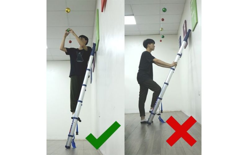 Đứng quá cao trên thang, đặc biệt là ở bậc trên cùng, là hành động rất nguy hiểm nhưng lại khá phổ biến. Khi đứng ở vị trí này, người dùng gần như không còn điểm tựa chắc chắn để giữ thăng bằng. Chỉ cần một cử động nhẹ hoặc với tay quá xa cũng có thể khiến cơ thể mất ổn định. Điều này dễ dẫn đến việc trượt chân hoặc ngã từ trên cao xuống. Vì vậy, luôn đứng ở bậc an toàn theo khuyến cáo của nhà sản xuất.