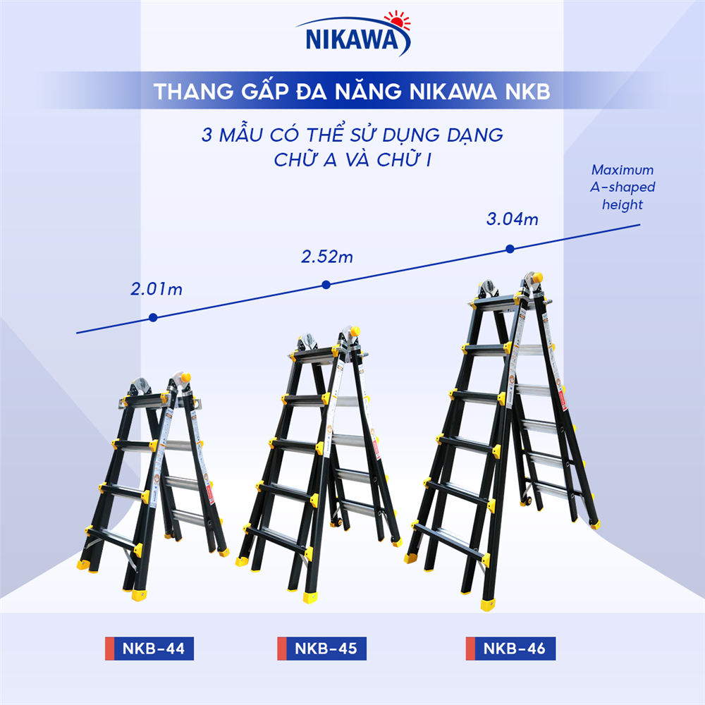 Thang nhôm gấp đa năng Nikawa NKB-44 đã có mặt tại Việt Nam, với thương hiệu Nikawa nổi tiếng bạn hoàn toàn có thể tin tưởng và chắc chắn sẽ đánh giá cao tính năng, chất lượng của nó. Nhiều hình dạng thang nhom chữ A, I, M bạn có thể thay đổi tùy thuộc vào tính chất và độ cao cần dùng của công việc.